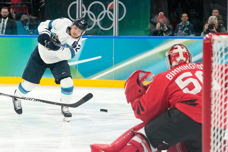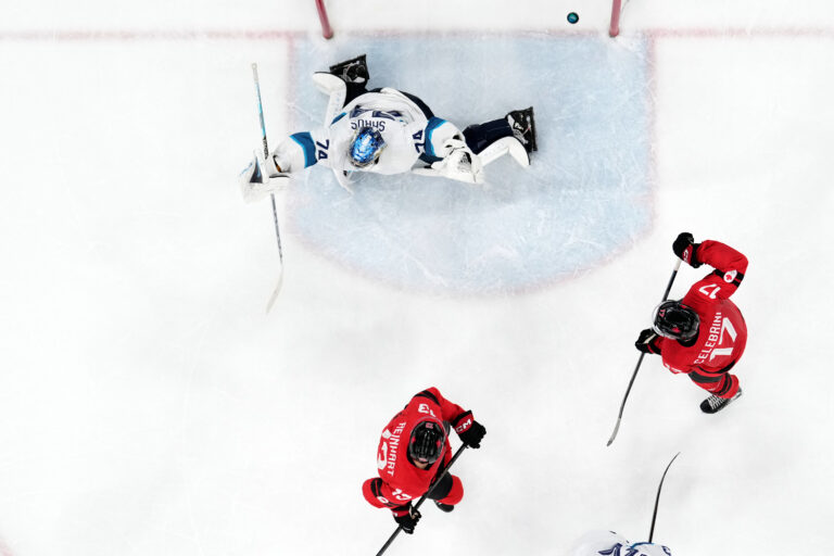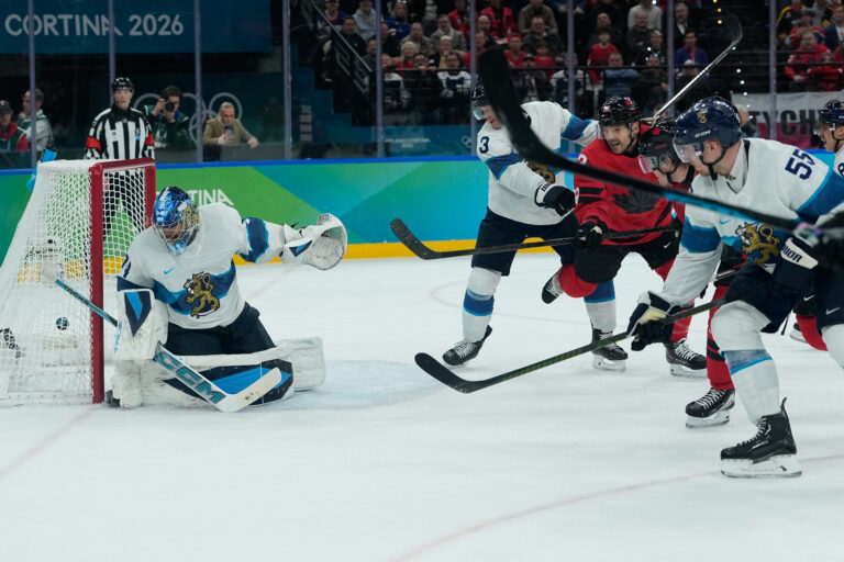 Puk v bránke Fínska po strele Nathana MacKinnona, ktorou rozhodol o výhre Kanady v semifinálovom zápase na zimnej olympiáde. Miláno (Santagiulia Ice Hockey Arena), 20. február 2026. Foto: Mike Segar/Pool Photo via AP.