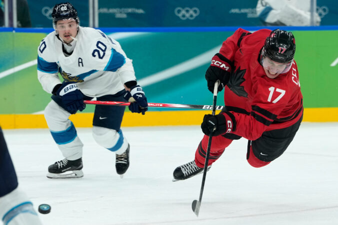 Kanadský útočník Macklin Celebrini (17) v súboji s fínskym obrancom Nikom Mikkolom (77) počas semifinálového zápasu na zimnej olympiáde. Miláno (Santagiulia Ice Hockey Arena), 20. február 2026. Foto: SITA/AP.