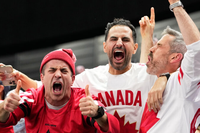 Kanadskí fanúšikovia sa radujú po góle ich tímu proti Fínsku počas semifinálového zápasu na zimnej olympiáde. Miláno (Santagiulia Ice Hockey Arena), 20. február 2026. Foto: SITA/AP.
