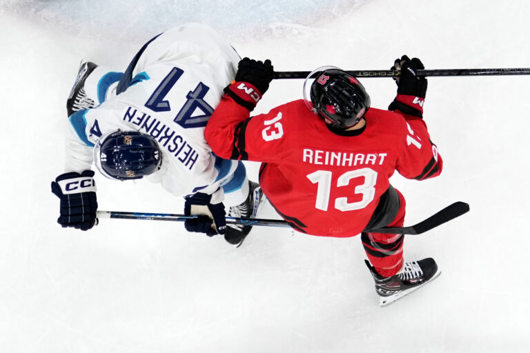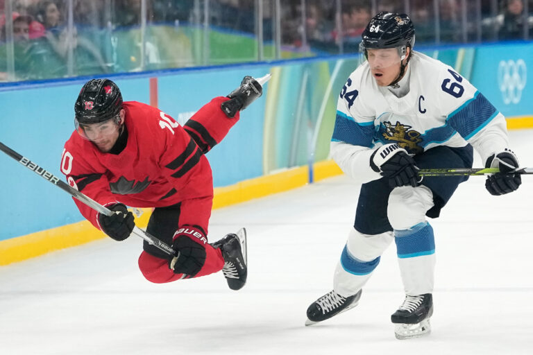 Kanaďan Nick Suzuki (vľavo) padá po súboji s fínskym kapitánom Mikaelom Granlundom počas semifinálového zápasu na zimnej olympiáde. Miláno (Santagiulia Ice Hockey Arena), 20. február 2026. Foto: SITA/AP.