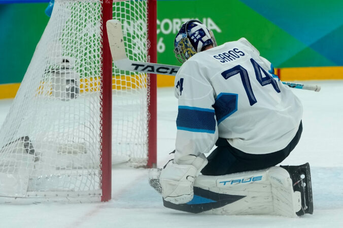 Smutný fínsky brankár Juuse Saros po inkasovanom rozhodujúcom góle počas semifinálového zápasu proti Kanade na zimnej olympiáde. Miláno (Santagiulia Ice Hockey Arena), 20. február 2026. Foto: Mike Segar/Pool Photo via AP.