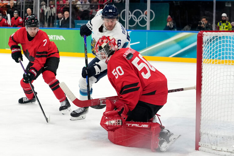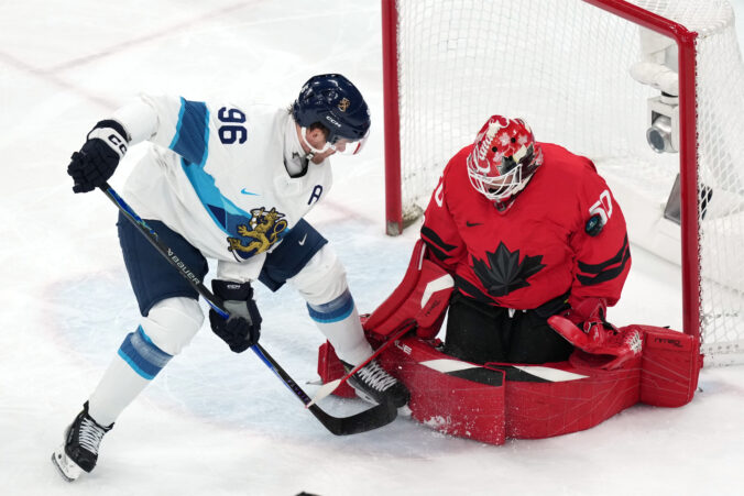 Kanadský brankár Jordan Binnington zasahuje proti Fínovi Mikkovi Rantanenovi počas semifinálového zápasu na zimnej olympiáde. Miláno (Santagiulia Ice Hockey Arena), 20. február 2026. Foto: SITA/AP.