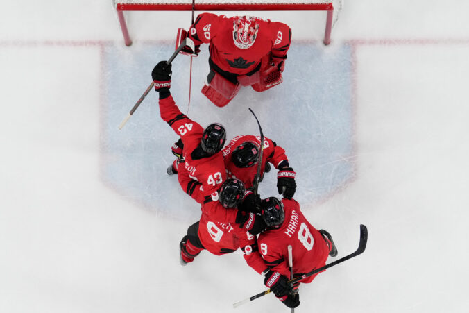 Hráči Kanady oslavujú so svojím brankárom Jordanom Binningtonom výhru nad Finskom v semifinálovom zápase na zimnej olympiáde. Miláno (Santagiulia Ice Hockey Arena), 20. február 2026. Foto: SITA/AP.