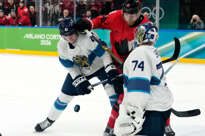 Kanaďan Sam Reinhart tečuje puk do fínskej bránky počas semifinálového zápasu na zimnej olympiáde. Miláno (Santagiulia Ice Hockey Arena), 20. február 2026. Foto: SITA/AP.