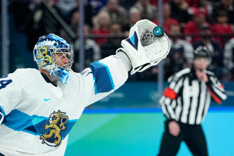 Fínsky brankár Juuse Saros chytá puk do lapačky počas semifinálového zápasu proti Kanade na zimnej olympiáde. Miláno (Santagiulia Ice Hockey Arena), 20. február 2026. Foto: SITA/AP.