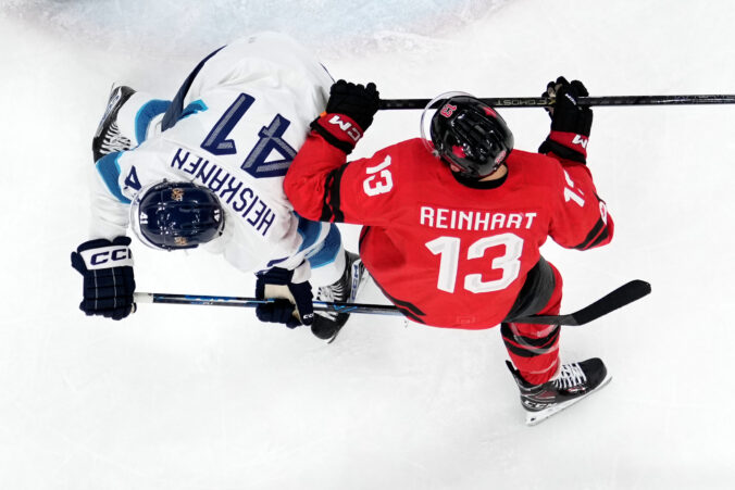 Fín Miro Heiskanen (vľavo) v súboji s Kanaďanom Samom Reinhartom počas semifinálového zápasu na zimnej olympiáde. Miláno (Santagiulia Ice Hockey Arena), 20. február 2026. Foto: SITA/AP.
