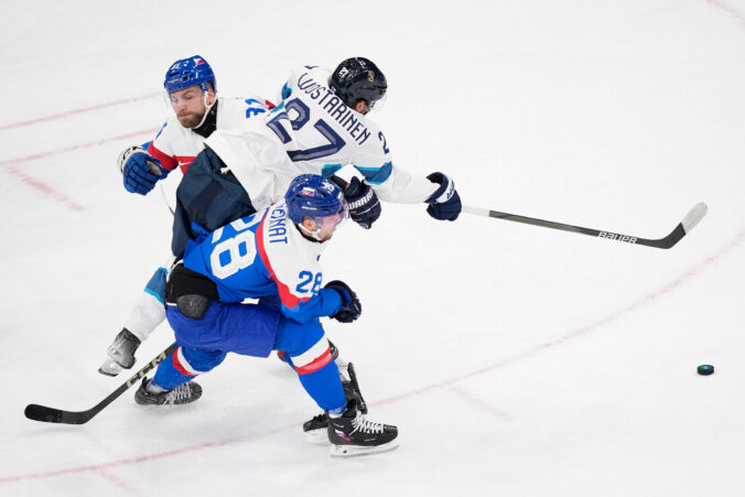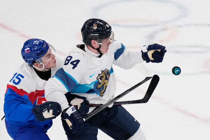 Slovenský útočník Adam Ružička v súboji s Fínom Nikom Mikkolom počas zápas základnej B-skupiny na zimnej olympiáde. Foto: SITA/AP.