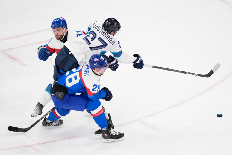 Slovenskí obrancovia Erik Černák a Martin Gernák v súboji s Fínom s Eetum Luostarinenom počas zápasu základnej B-skupiny na zimnej olympiáde. Miláno (Santa Giulia Ice Hockey Arena), 11. február 2026. Foto: SITA/AP.