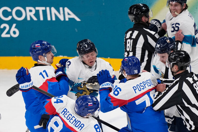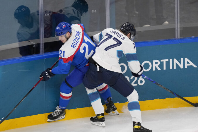 Potýčka v zápase Slovensko - Fínsko v základnej B-skupine na zimnej olympiáde. Miláno (Santa Giulia Ice Hockey Arena), 11. február 2026. Foto: SITA/AP.