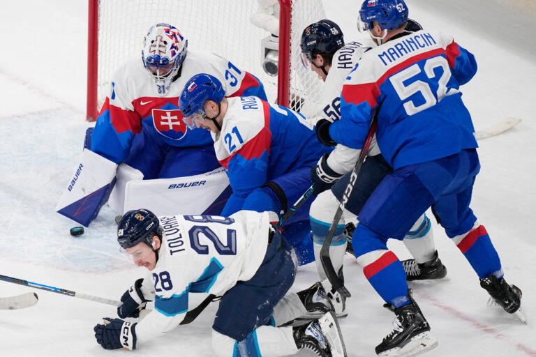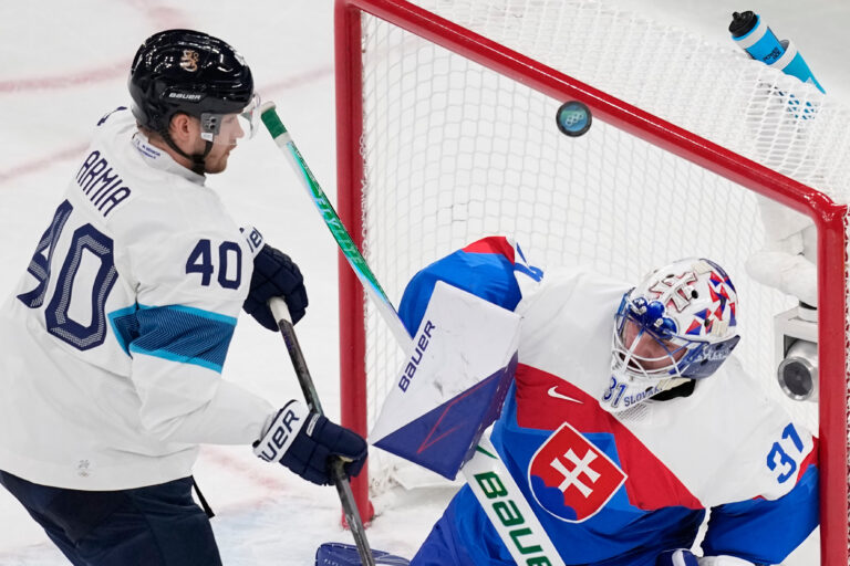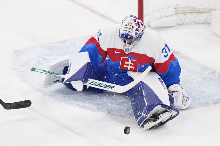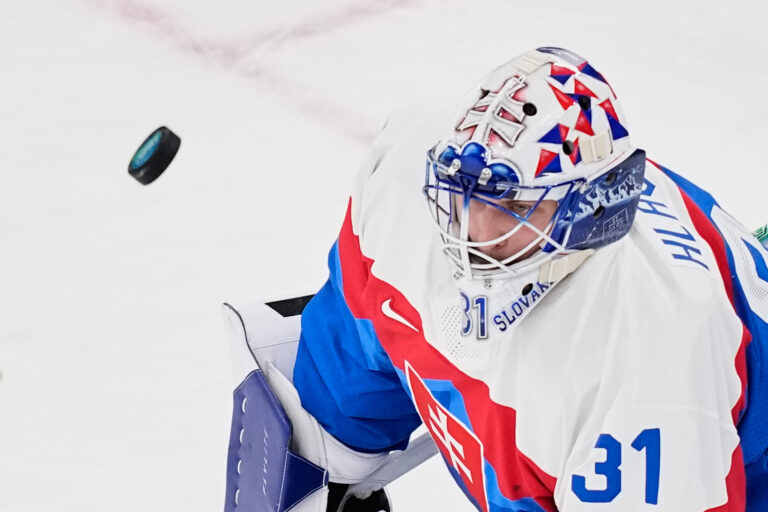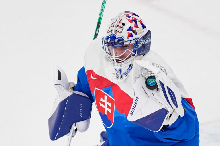 Slovenský brankár Samuel Hlavaj chytá puk v zápase proti Fínsku v základnej B-skupine na zimnej olympiáde. Miláno (Santa Giulia Ice Hockey Arena), 11. február 2026. Foto: SITA/AP.