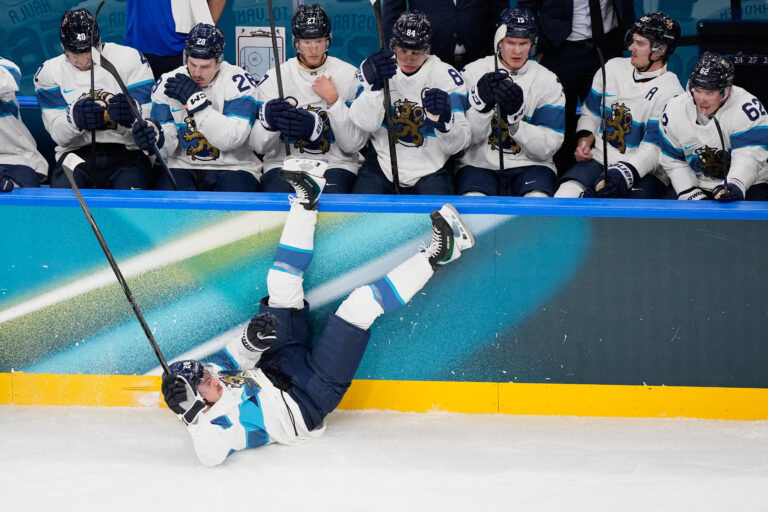 Pád fínskeho útočníka Roopa Hintza v zápase proti Slovensku v základnej B-skupine na zimnej olympiáde. Miláno (Santa Giulia Ice Hockey Arena), 11. február 2026. Foto: SITA/AP.
