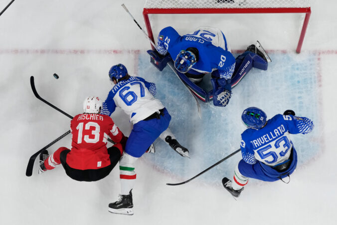 Italy's Damian Clara (20) makes a save against Switzerland's Timo Meier (28) during a men's ice hockey qualification playoff game between Switzerland and Italy at the 2026 Winter Olympics, in Milan, Italy, Tuesday, Feb. 17, 2026. Foto: SITA/AP.