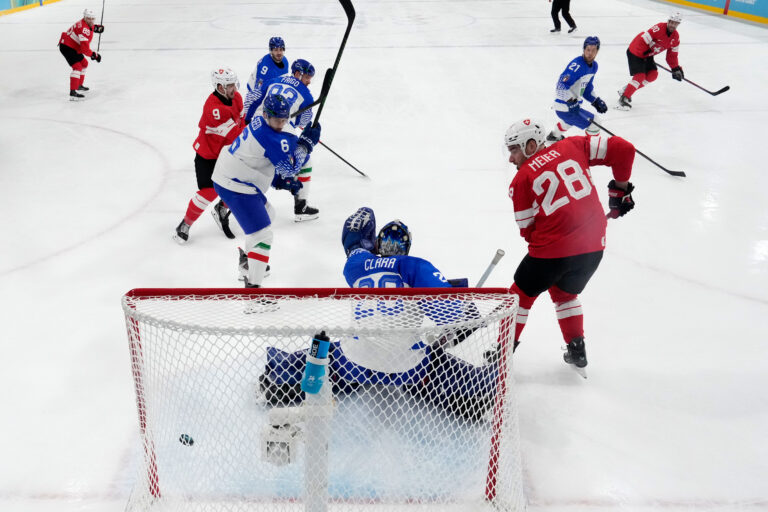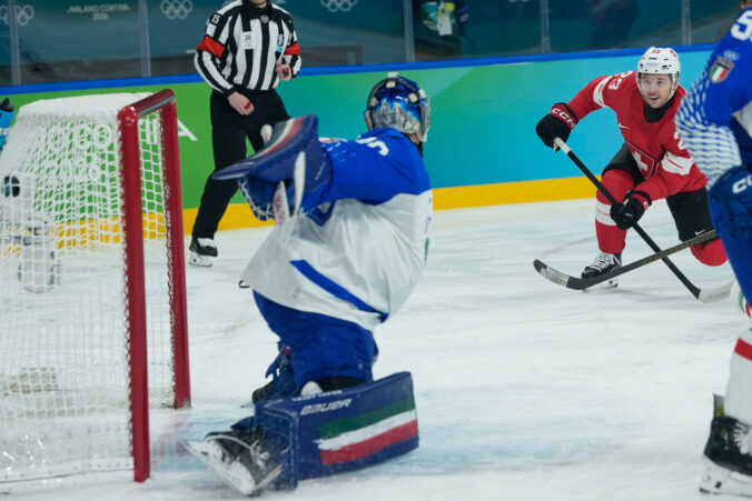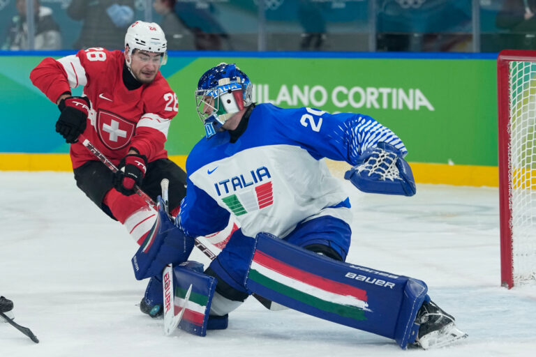 Switzerland's Philipp Kurashev shoots to score his sides first goal past Italy's goalkeeper Damian Clara during a men's ice hockey qualification playoff game between Switzerland and Italy at the 2026 Winter Olympics, in Milan, Italy, Tuesday, Feb. 17, 2026. Foto: SITA/AP.