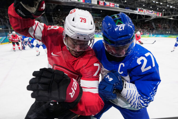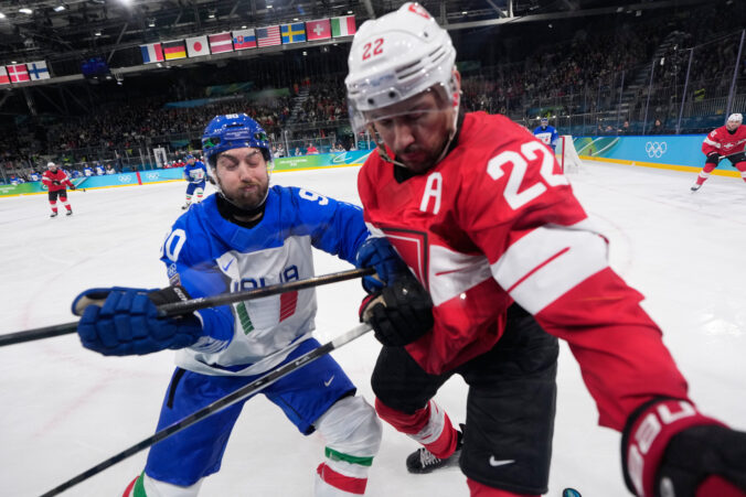 Italy's Damian Clara (20) challenges with Switzerland's Calvin Thurkauf (79) during a men's ice hockey qualification playoff game between Switzerland and Italy at the 2026 Winter Olympics, in Milan, Italy, Tuesday, Feb. 17, 2026. Foto: SITA/AP.