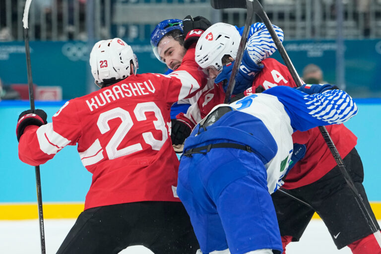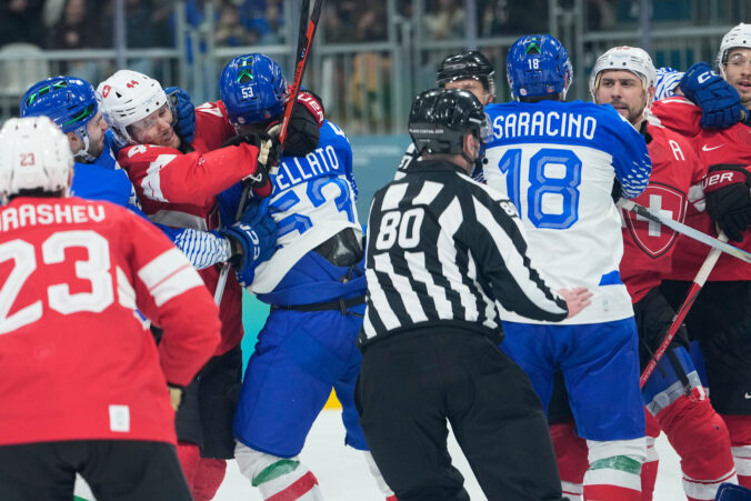 Referees try to break up a fight during a men's ice hockey qualification playoff game between Switzerland and Italy at the 2026 Winter Olympics, in Milan, Italy, Tuesday, Feb. 17, 2026. Foto: SITA/AP.