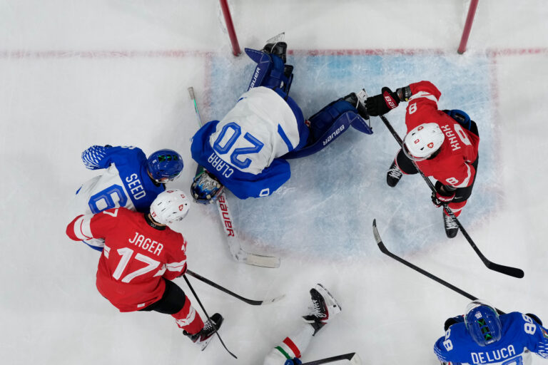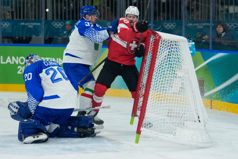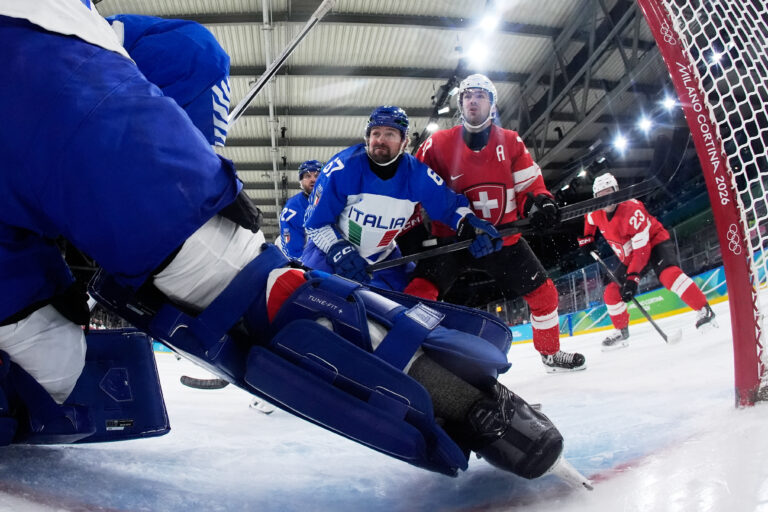 Italy's Damian Clara fa its to save a shot by =Switzerland's Philipp Kurashev during a men's ice hockey qualification playoff game between Switzerland and Italy at the 2026 Winter Olympics, in Milan, Italy, Tuesday, Feb. 17, 2026. Foto: SITA/AP.