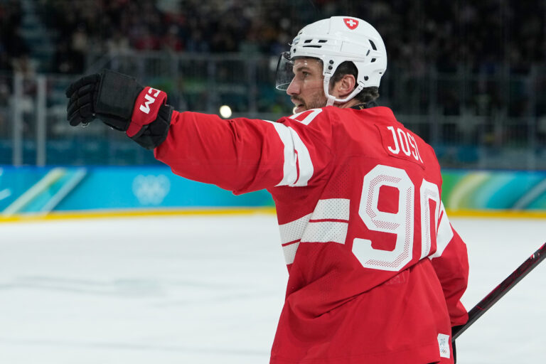 Switzerland's Roman Josi (90) scores his side's second goal during a men's ice hockey qualification playoff game between Switzerland and Italy at the 2026 Winter Olympics, in Milan, Italy, Tuesday, Feb. 17, 2026. Foto: SITA/AP.