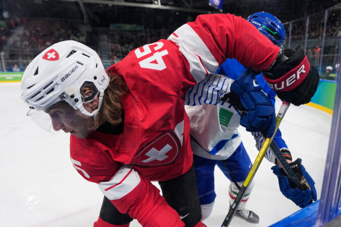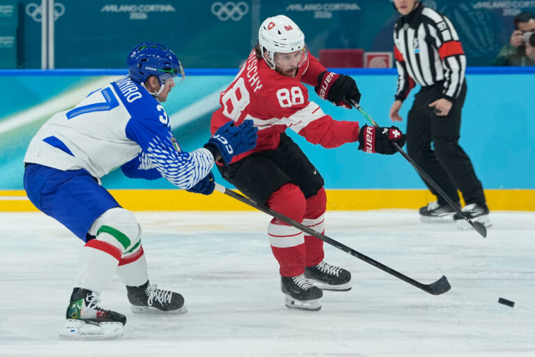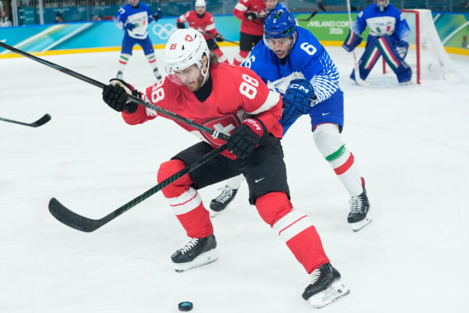 Italy's Dylan di Perna (90) challenges Switzerland's Nino Niederreiter (22) during a men's ice hockey qualification playoff game between Switzerland and Italy at the 2026 Winter Olympics, in Milan, Italy, Tuesday, Feb. 17, 2026. Foto: SITA/AP.