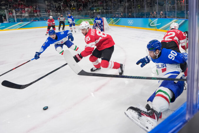 Italy's Mats Frycklund (67) challenges with Switzerland's Nico Hischier (13) during a men's ice hockey qualification playoff game between Switzerland and Italy at the 2026 Winter Olympics, in Milan, Italy, Tuesday, Feb. 17, 2026. Foto: SITA/AP.
