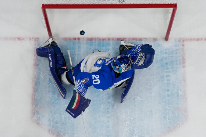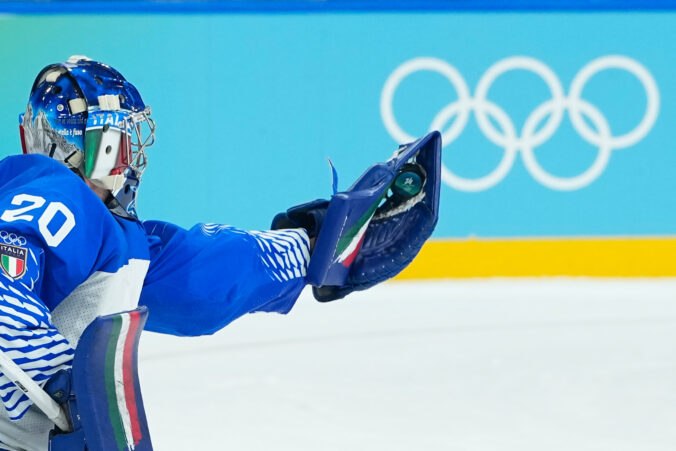 Italy's Damian Clara (20) makes a save during a men's ice hockey qualification playoff game between Switzerland and Italy at the 2026 Winter Olympics, in Milan, Italy, Tuesday, Feb. 17, 2026. Foto: SITA/AP.