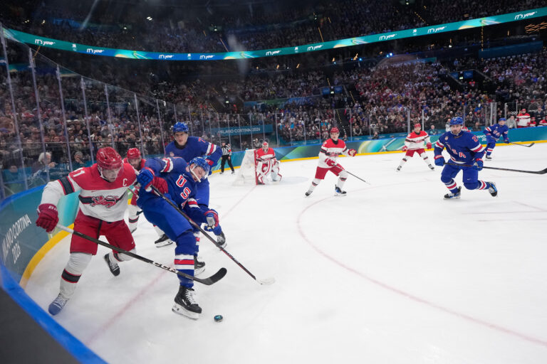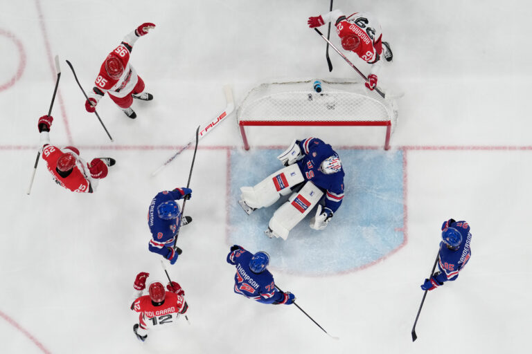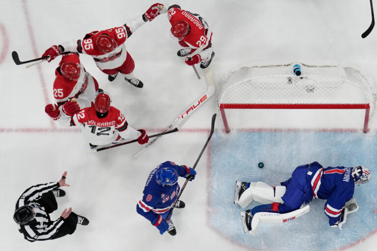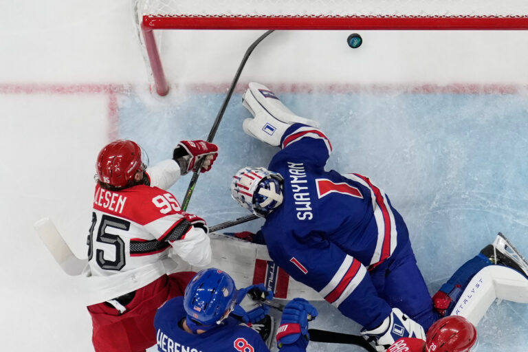Gól dánskeho útočníka Nicka Olesena na 1:0 v zápase proti USA v základnej C-skupiny na zimnej olympiáde. Miláno (Santa Giulia Ice Hockey Arena), 14. február 2026. Foto: Bruce Bennett/Pool Photo via AP.