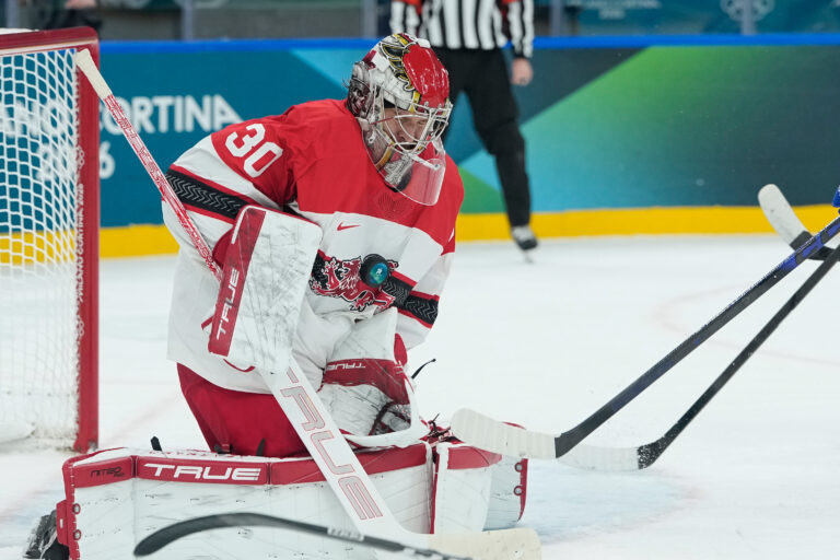 Dánsky gólman Mads Sogaard počas zápasu proti USA v základnej C-skupine na zimnej olympiáde. Miláno (Santa Giulia Ice Hockey Arena), 14. február 2026. Foto: SITA/AP.