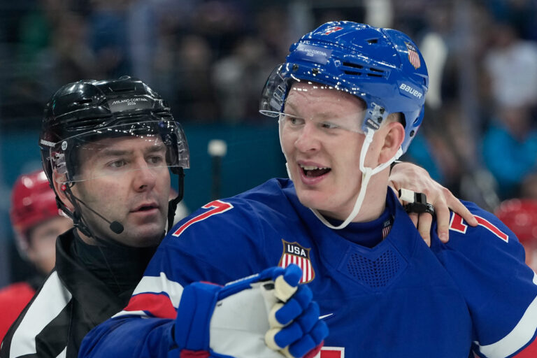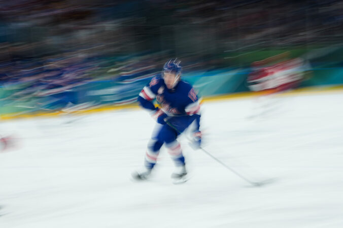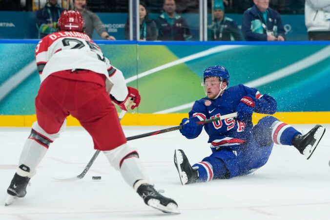 Americký útočník Matt Boldy v zápasu proti Dánku v základnej C-skupine na zimnej olympiáde. Miláno (Santa Giulia Ice Hockey Arena), 14. február 2026. Foto: SITA/AP.