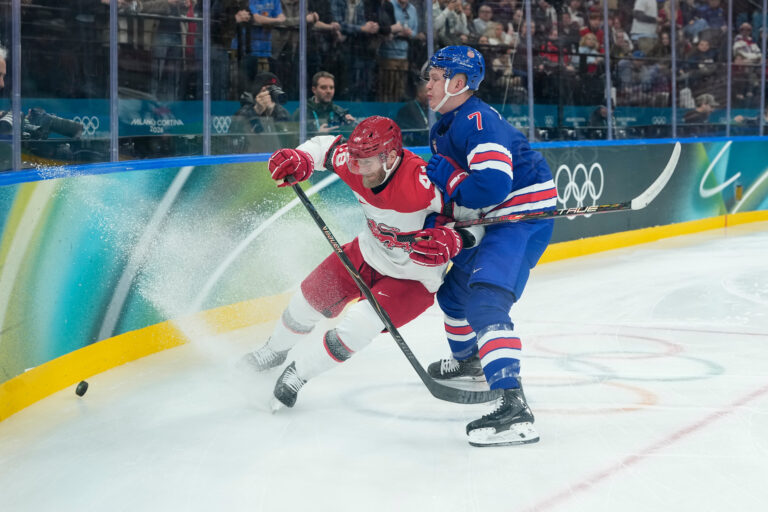 Dán Nicholas Jensen v súboji s americký útočníkom Bradym Tkachukom počas zápasu základnej C-skupiny na zimnej olympiáde. Miláno (Santa Giulia Ice Hockey Arena), 14. február 2026. Foto: SITA/AP.