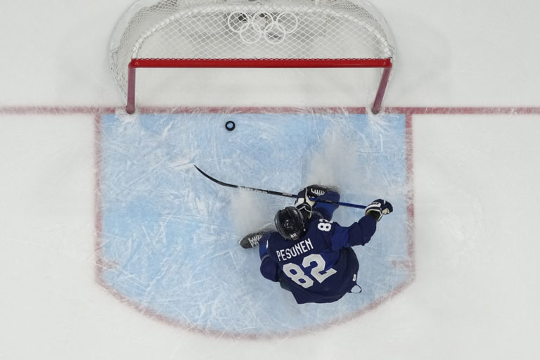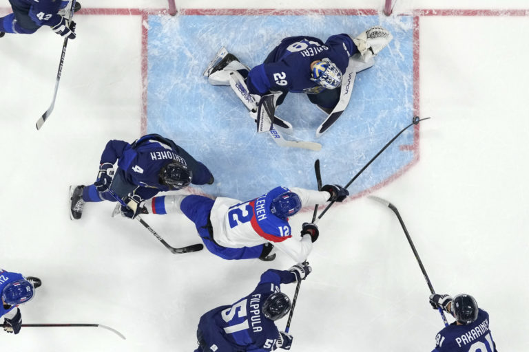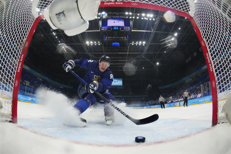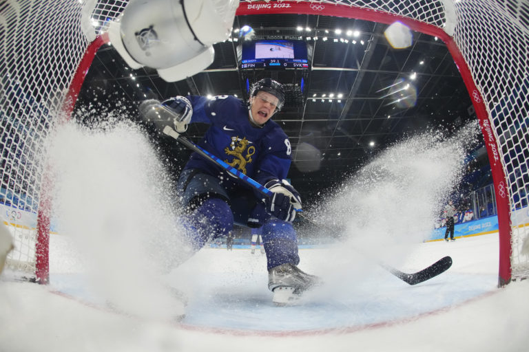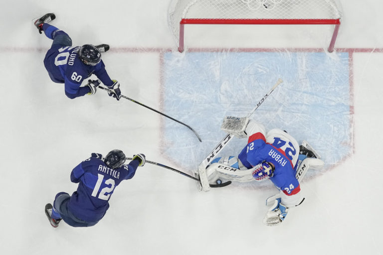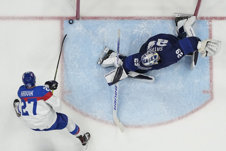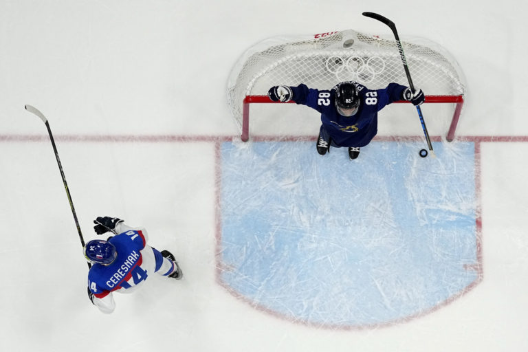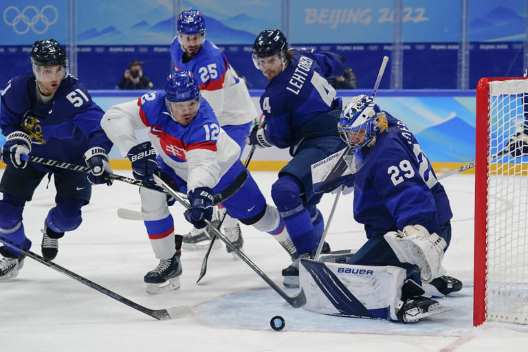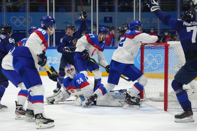 Fínsky útočník Harri Pesonen strieľa gól do opustenej slovenskej bránky počas semifinálového zápasu na zimnej olympiáde. Peking, 18. február 2022. Foto: SITA/AP.