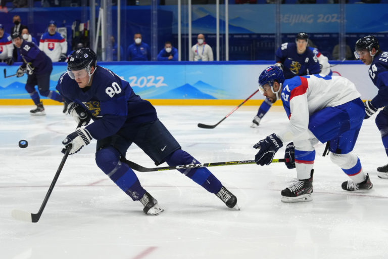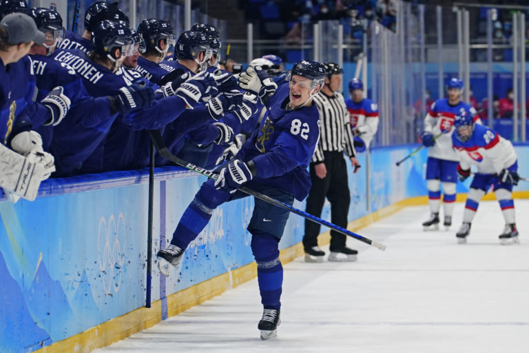 Fínsky útočník Harri Pesonen (82) sa teší zo svojho gólu v sieti Slovenska počas semifinálového zápasu na zimnej olympiáde. Peking, 18. február 2022. Foto: SITA/AP.