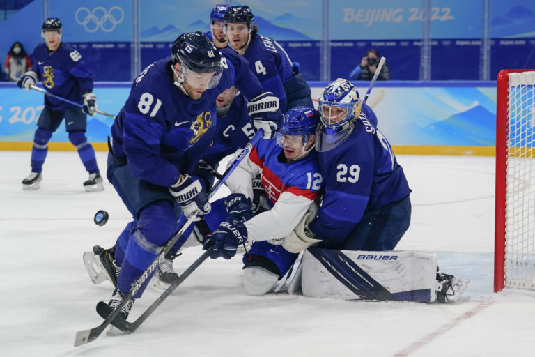Slovenský útočník Miloš Kelemen v súboji s Fínom Iirom Pakarinenom pred brankárom Harrim Säterim počas semifinálového zápasu na zimnej olympiáde. Peking, 18. február 2022.