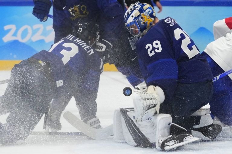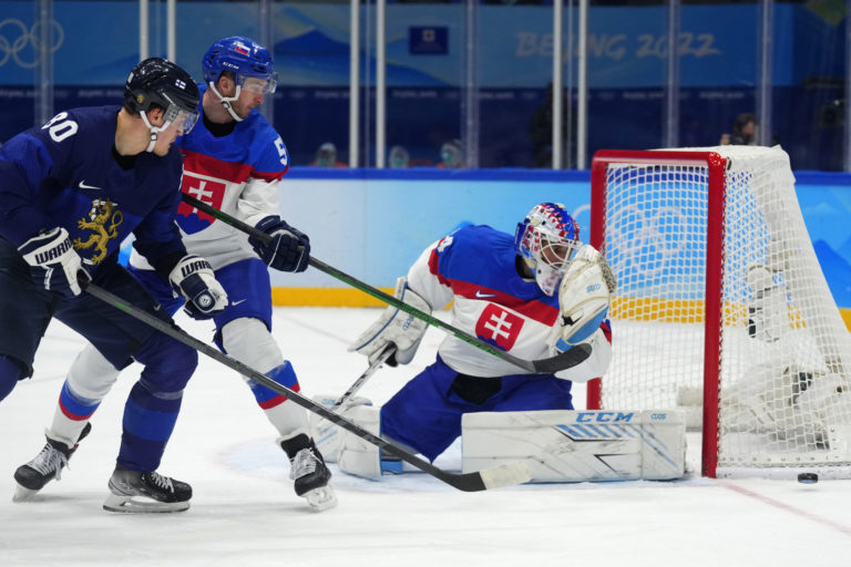 Zákrok fínskeho gólmana Harriho Säteriho počas semifinálového zápasu proti Slovensku na zimnej olympiáde. Peking, 18. február 2022. Foto: SITA/AP.