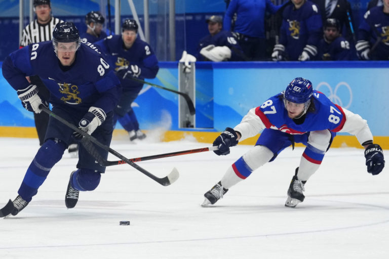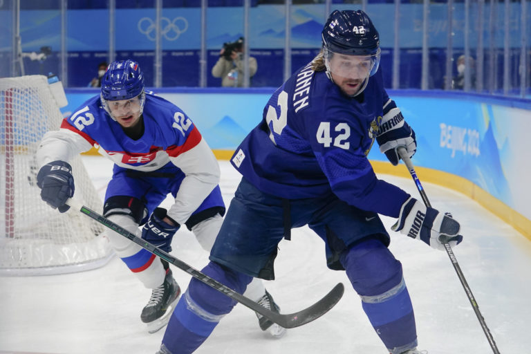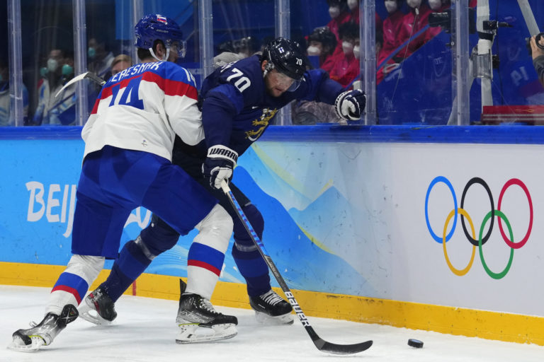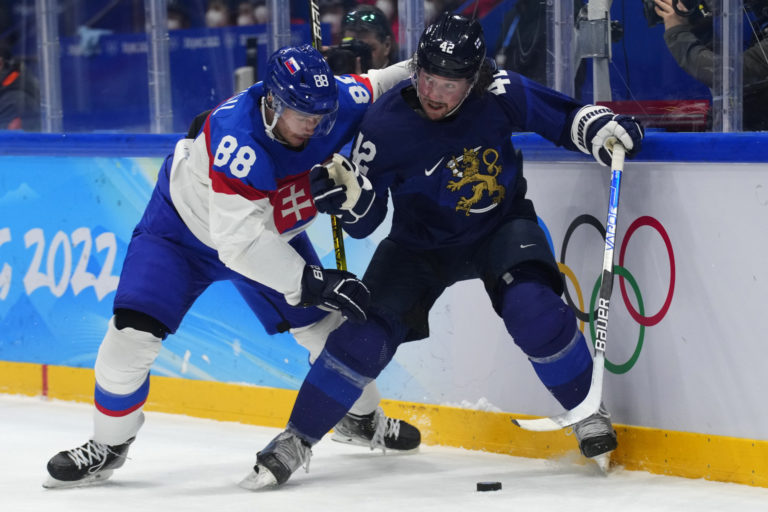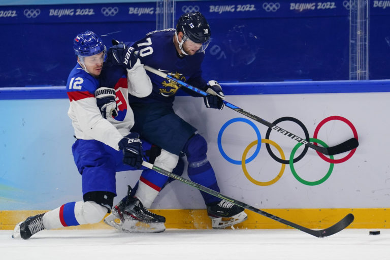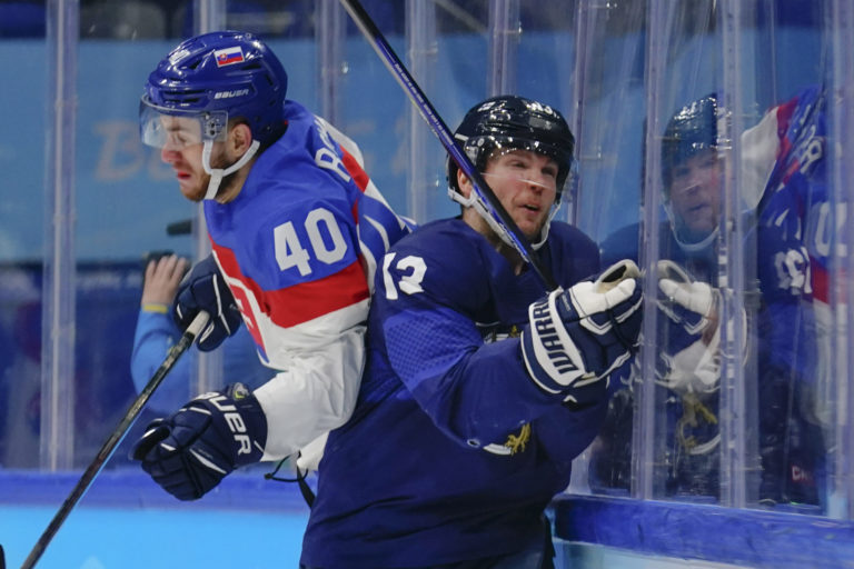 Slovenský útočník Pavol Regenda sa snaží zastaviť Fína Saka Maenalanena počas semifinálového zápasu na zimnej olympiáde. Peking, 18. február 2022. Foto: SITA/AP.