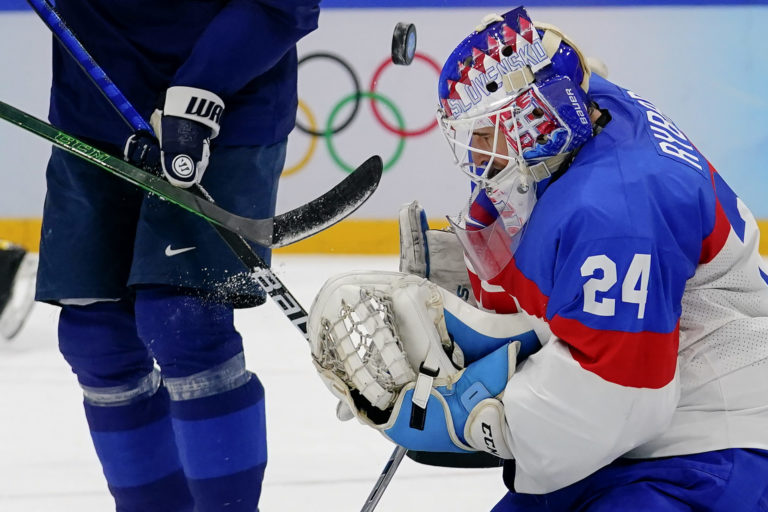 Zákrok slovenského brankára Patrika Rybára počas semifinálového zápasu proti Fínsku na zimnej olympiáde. Peking, 18 február 2022. Foto: SITA/AP.