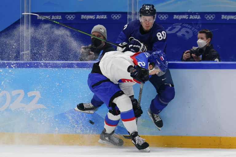 Slovenský kapitán Marek Hrivík sa snaží zastaviť fínskeho útočníka Saka Mäenalanena počas semifinálového zápasu na zimnej olympiáde. Peking, 18. február 2022. Foto: SITA/AP.