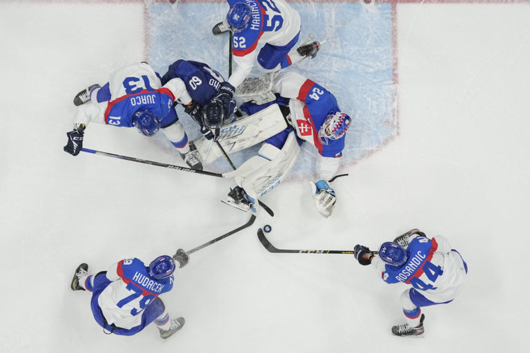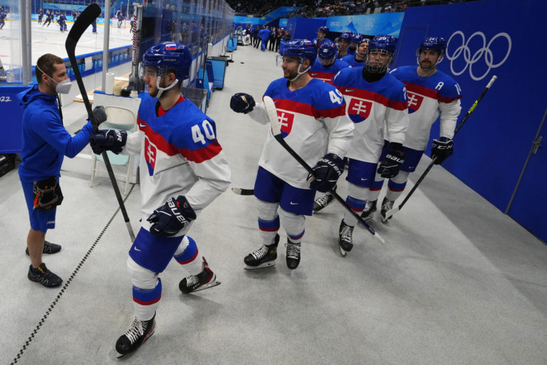 Slovenskí hokejisti pred semifinálovým zápasom proti Fínom na zimnej olympiáde. Peking, 18. február 2022. Foto: SITA/AP.