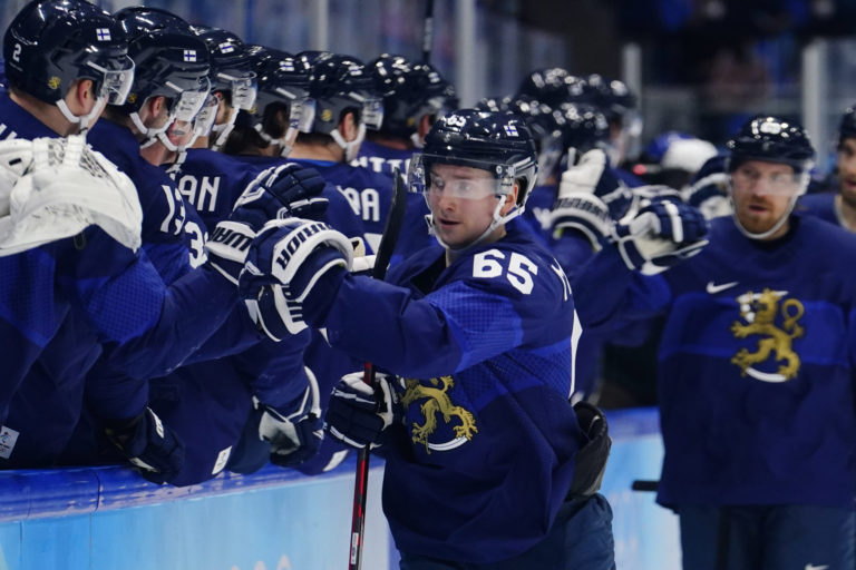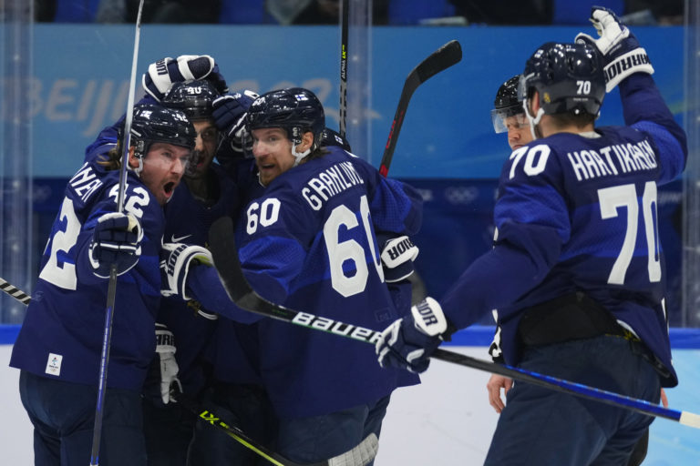Fínsky útočník Sakari Manninen sa so spoluhráčmi teší zo svojho gólu v sieti Slovenska počas semifinálového zápasu na zimnej olympiáde. Peking, 18. február 2022. Foto: SITA/AP.