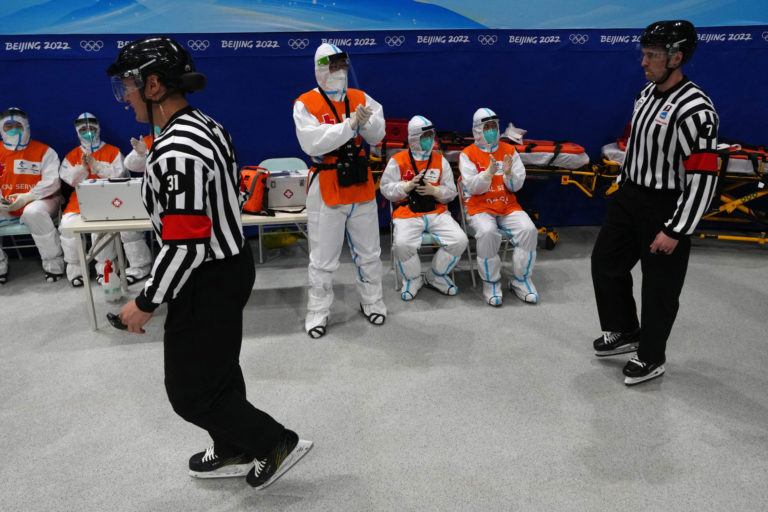 Rozhodcovia Jevgenij Romasko a Olivier Gouin pred zápasom o bronzové medaily medzi Slovenskom a Švédskom na zimnej olympiáde. Peking, 19. február 2022. Foto: SITA/AP.