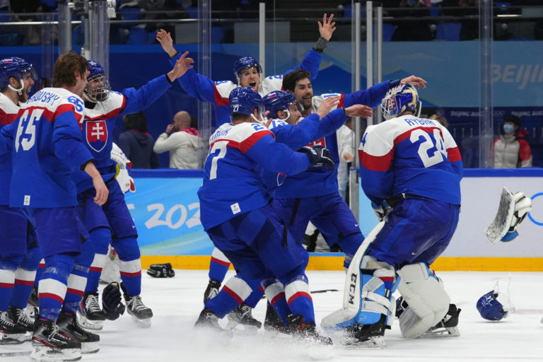 Radosť slovenských hokejistov po triumfe nad Švédmi v zápase o bronzové medaily na zimnej olympiáde. Peking, 19. február 2022. Foto: SITA