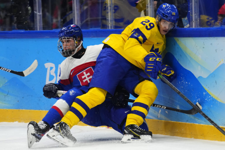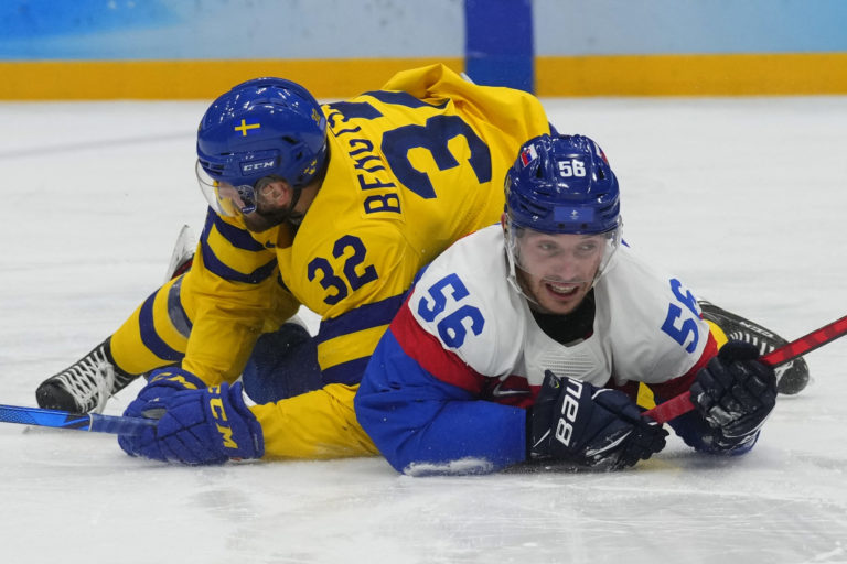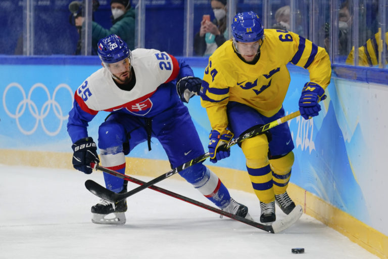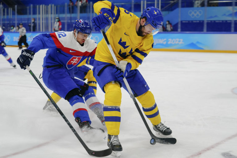 Slovenský útočník Marko Daňo v súboji so Švédom Lukasom Bengtssonom počas zápasu o bronzové medaily na zimnej olympiáde. Peking, 19. február 2022. Foto: SITA/AP.