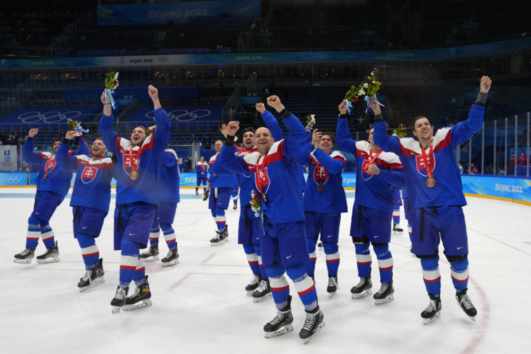 Slovenskí hokejisti s bronzovými medailami po triumfe nad Švédmi v zápase o tretie miesto na zimnej olympiáde. Peking, 19. február 2022. Foto: SITA/AP.