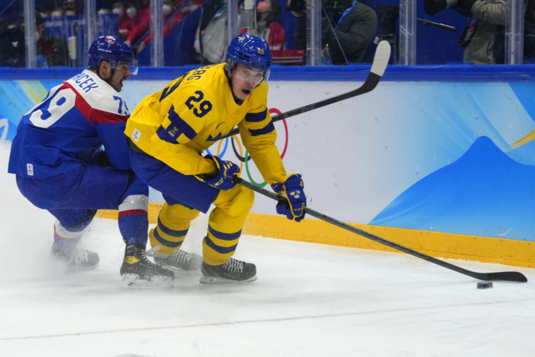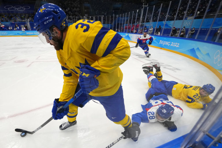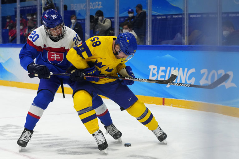Švédsky útočník Lukas Bengtsson (32) počas zápasu o bronzové medaily proti Slovensku na zimnej olympiáde. Peking, 19. február 2022. Foto: SITA/AP.