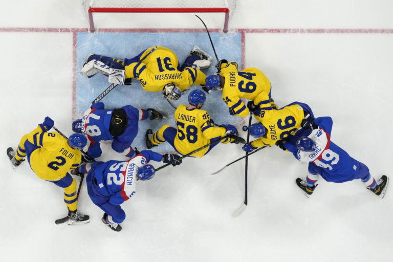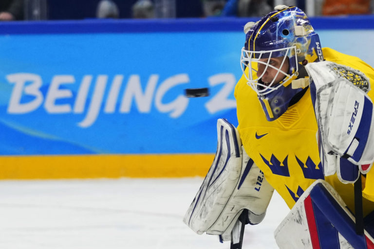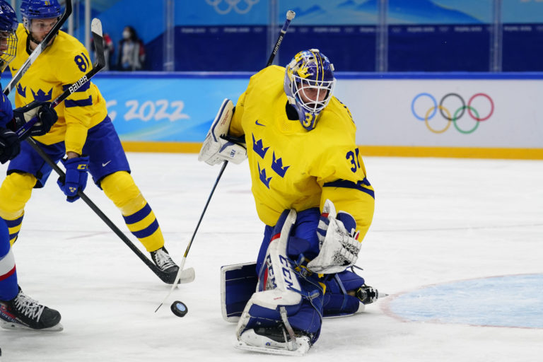 Zákrok švédskeho gólmana Larsa Johanssona počas zápasu o bronzové medaily proti Slovensku na zimnej olympiáde. Peking, 19. február 2022. Foto: SITA/AP.