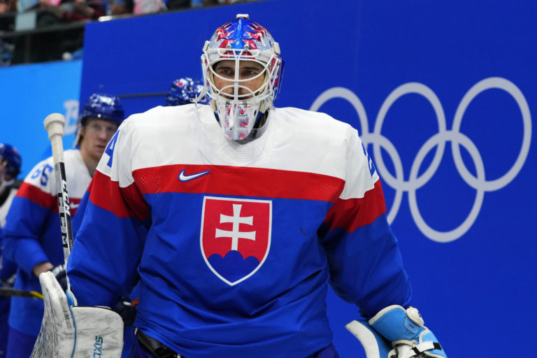 Slovenský brankár Patrik Rybár pred zápasom o bronzové medaily proti Švédsku na zimnej olympiáde. Peking, 19. február 2022. Foto: SITA/AP.