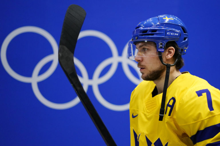 Švédsky obranca Henrik Tömmernes pred zápasom o bronzové medaily proti Slovensku na zimnej olympiáde. Peking, 19. február 2022. Foto: SITA/AP.