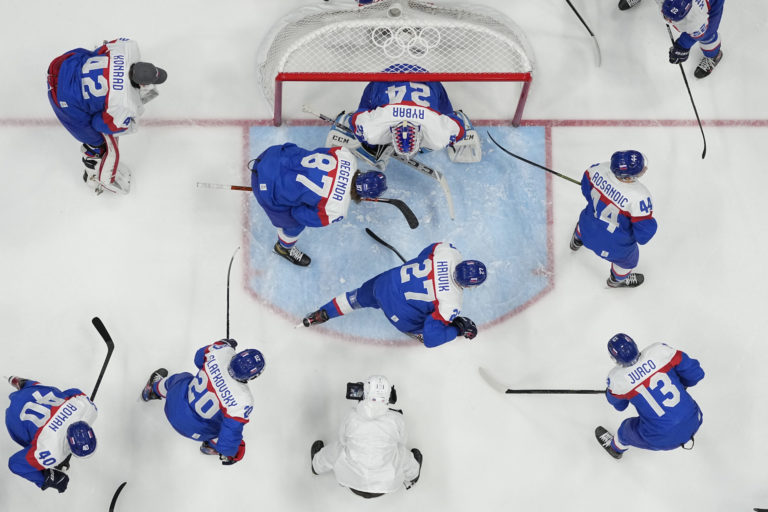 Slovenskí hokejisti pred zápasom o bronzové medaily proti Švédom na zimnej olympiáde. Peking, 19 február 2022. Foto: SITA/AP.