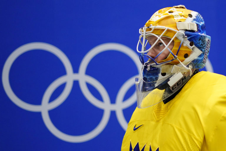 Švédsky gólman Magnus Hellberg pred zápasom o bronzové medaily proti Slovensku na zimnej olympiáde. Peking, 19. február 2022. Foto: SITA/AP.