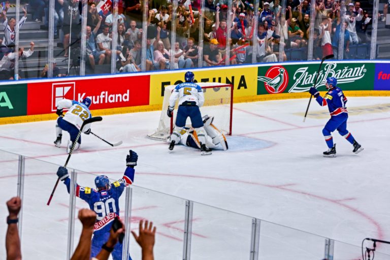 Slovenský útočník Róbert Lantoši strieľa úvodný gól zápasu olympijskej kvalifikácie proti Kazachstanu. Bratislava, 1. september 2024. Foto: SITA/Tomáš Susko.
