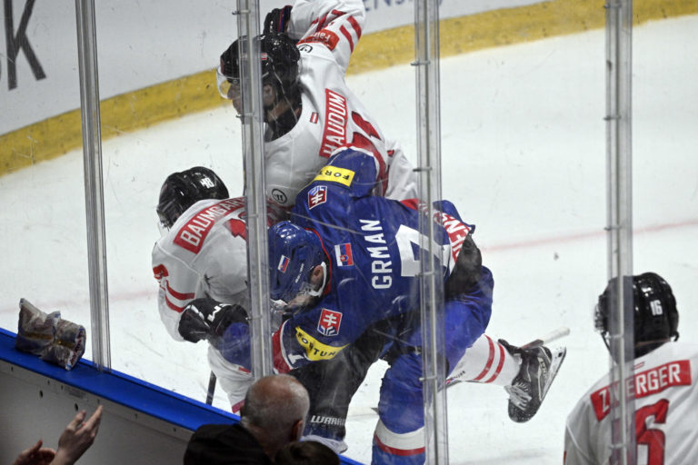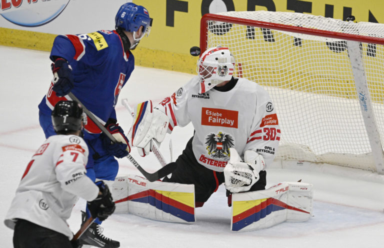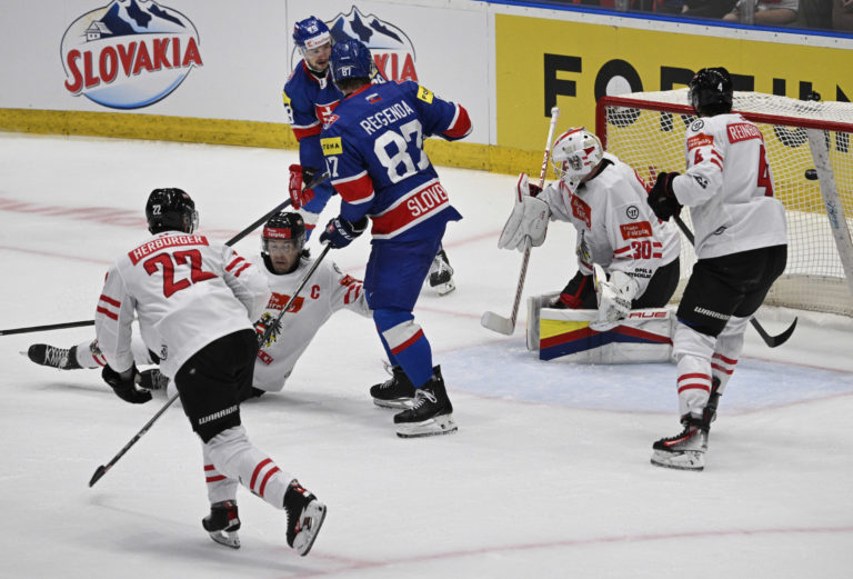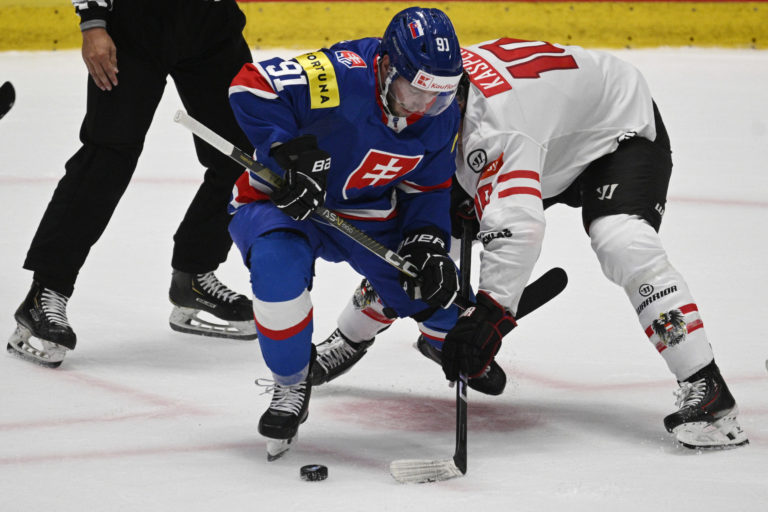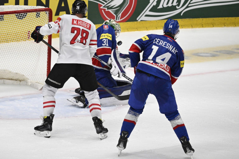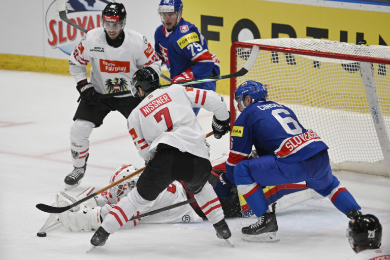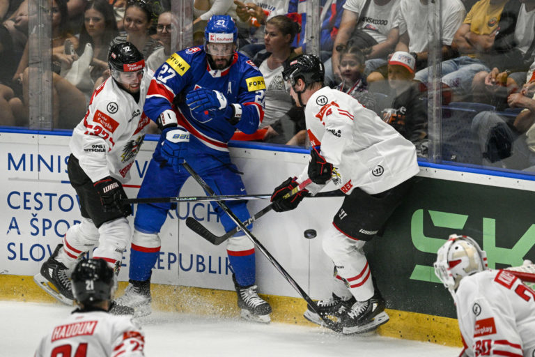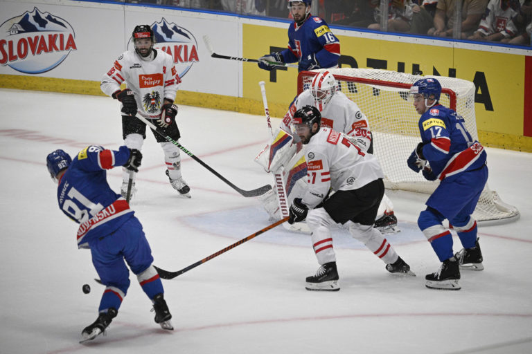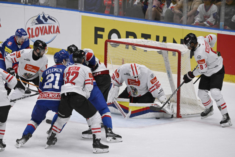 Slovenský obranca Peter Čerešňák v súboji s Rakúšanom Marcom Kasperom pred brankárom Samuelom Hlavajom Slovenský útočník Marek Hrivík v súboji s Rakúšanom Bernom Wolfom počas zápasu kvalifikácie o postup na zimnú olympiáde 2026 do Turína. Bratislava, 29. august 2024. Foto: SITA/Milan Illík.