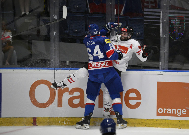 Slovenský útočník Marek Hrivík v súboji s Rakúšanom Bernom Wolfom počas zápasu kvalifikácie o postup na zimnú olympiáde 2026 do Turína. Bratislava, 29. august 2024. Foto: SITA/Milan Illík.